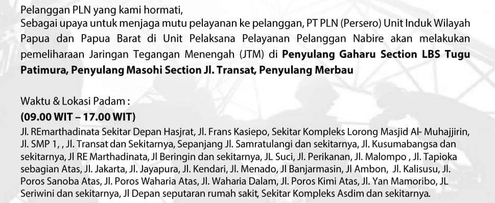 Nabire – Guna kehandalan jaringan Distribusi dan Pembangkit, maka PT. PLN Unit Induk Wilayah Papua & Papua Barat Unit Pelaksana Pelayanan Pelanggan Nabire akan melakukan pemadaman listrik, dalam rangka pekerjaan Total Maintenance Feeder (TMF) Penyulang Gaharu Section LBS Tugu Pattimura, Penyulang Masohi Section Jl.Transat, Penyulang Merbau.
