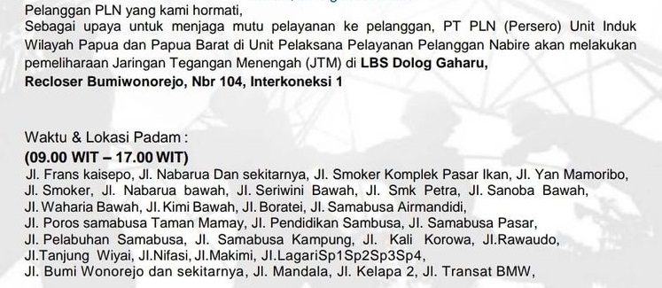 Nabire – Guna kehandalan jaringan Distribusi dan Pembangkit, maka PT. PLN Unit Induk Wilayah Papua & Papua Barat Unit Pelaksana Pelayanan Pelanggan Nabire akan melakukan pemadaman listrik, dalam rangka pekerjaan pemeliharaan JTM LBS Dolog Gaharu, Recloser Bumi Wonorejo, NBR 104, Interkoneksi 1.
