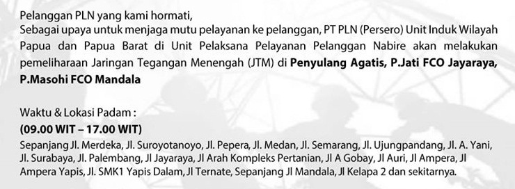 Atas ketidaknyamannya, PT. PLN Rayon Nabire memohon maaf kepada pelanggan PLN di Nabire.