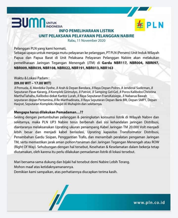 Atas ketidaknyamannya, PT. PLN Rayon Nabire memohon maaf kepada pelanggan PLN di Nabire.