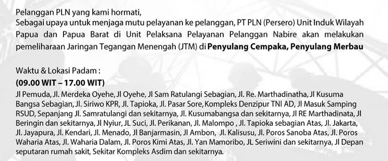 Atas ketidaknyamannya, PT. PLN Rayon Nabire memohon maaf kepada pelanggan PLN di Nabire.