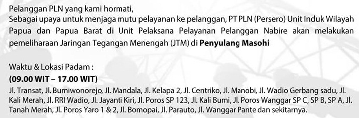 Nabire – Guna kehandalan jaringan Distribusi dan Pembangkit, maka PT. PLN Unit Induk Wilayah Papua & Papua Barat Unit Pelaksana Pelayanan Pelanggan Nabire akan melakukan pemadaman listrik, dalam rangka pekerjaan Total Maintenance Feeder (TMF) Penyulang Masohi.
