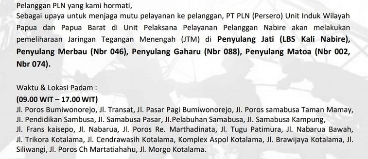 Nabire – Guna kehandalan jaringan Distribusi dan Pembangkit, maka PT. PLN Unit Induk Wilayah Papua & Papua Barat Unit Pelaksana Pelayanan Pelanggan Nabire akan melakukan pemadaman listrik, dalam rangka pekerjaan pemeliharaan JTM Penyulang Jati (LBS Kali Nabire), Penyulang Merbau (NBR 046), Penyulang Gaharu (NBR 088), Penyulang Matoa (NBR 002, 074).