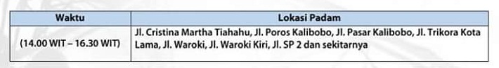 Pemadaman listrik tersebut akan dilaksanakan pada hari Sabtu, 11 Juli 2020, mulai pukul 09.00 s/d 17.00 Wit.