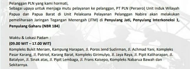 Nabire – Guna kehandalan jaringan Distribusi dan Pembangkit, maka PT. PLN Unit Induk Wilayah Papua & Papua Barat Unit Pelaksana Pelayanan Pelanggan Nabire akan melakukan pemadaman listrik, dalam rangka pekerjaan pemeliharaan JTM Penyulang Jati, Interkoneksi 1, Gaharu NBR 184.