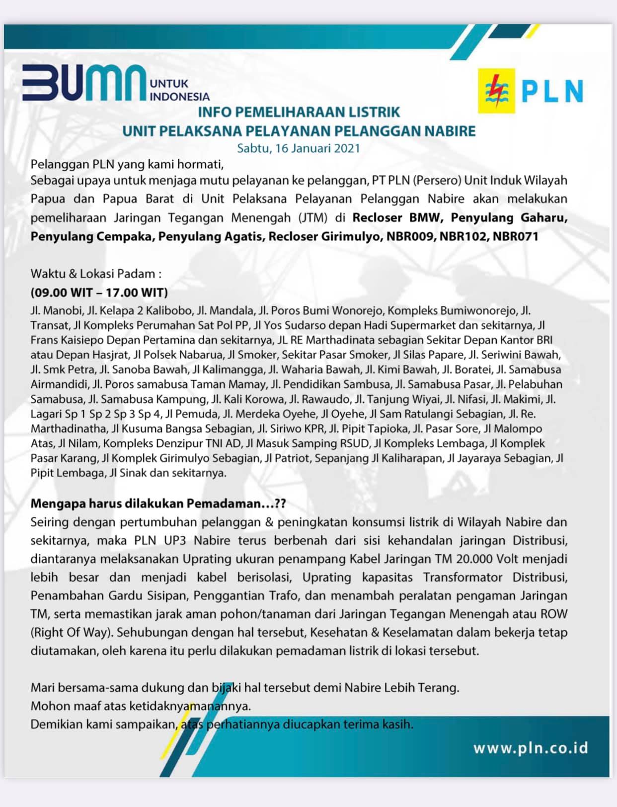 Atas ketidaknyamannya, PT. PLN Rayon Nabire memohon maaf kepada pelanggan PLN di Nabire.
