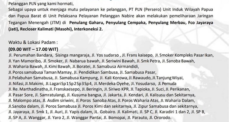 Nabire – Guna kehandalan jaringan Distribusi dan Pembangkit, maka PT. PLN Unit Induk Wilayah Papua & Papua Barat Unit Pelaksana Pelayanan Pelanggan Nabire akan melakukan pemadaman listrik, dalam rangka pekerjaan pemeliharaan JTM penyulang Gaharu, Cempaka, Merbau, FCO Jayaraya, Recloser Kalimati, Interkoneksi 2.
