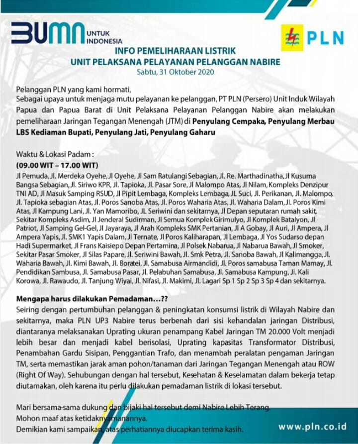 Atas ketidaknyamannya, PT. PLN Rayon Nabire memohon maaf kepada pelanggan PLN di Nabire.