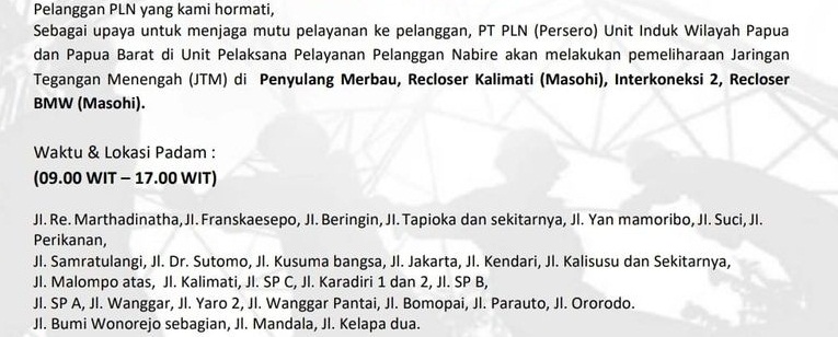 Nabire – Guna kehandalan jaringan Distribusi dan Pembangkit, maka PT. PLN Unit Induk Wilayah Papua & Papua Barat Unit Pelaksana Pelayanan Pelanggan Nabire akan melakukan pemadaman listrik, dalam rangka pekerjaan pemeliharaan JTM Penyulang Merbau, Penyulang Recloser Kalimati, Interkoneksi 2, Recloser BMW Masohi.