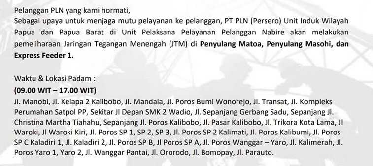 Nabire – Guna kehandalan jaringan Distribusi dan Pembangkit, maka PT. PLN Unit Induk Wilayah Papua & Papua Barat Unit Pelaksana Pelayanan Pelanggan Nabire akan melakukan pemadaman listrik, dalam rangka pekerjaan pemeliharaan JTM penyulang Matoa, Masohi, Express Feeder 1.