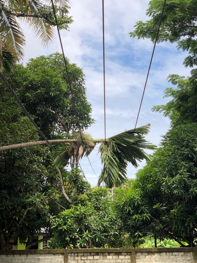 Pekerjaan yang dilaksanakan yaitu pembersihan pohon pinang yang tumbang menimpa JTM di Kompleks Batalyon.