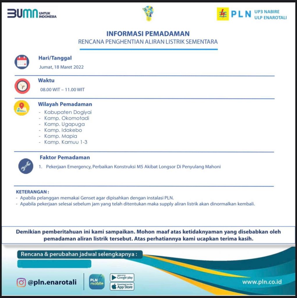 Pemadaman listrik tersebut akan dilaksanakan di kabupaten Dogiyai dan sekitarnya pada hari Jumat, 18 Maret 2022, mulai pukul 08.00 s/d 11.00 WIT.