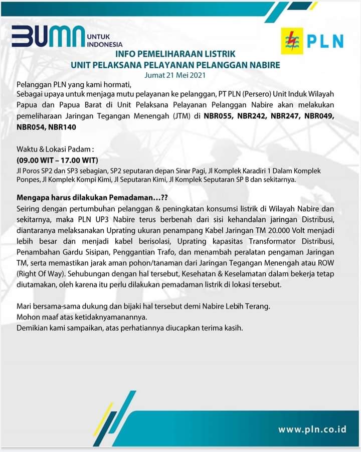 Atas ketidaknyamannya, PT. PLN Rayon Nabire memohon maaf kepada pelanggan PLN di Nabire.