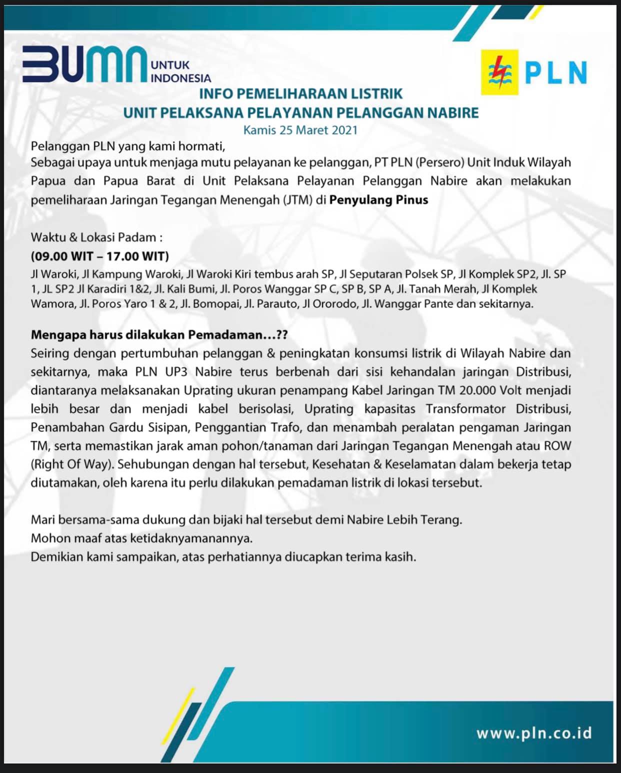 Atas ketidaknyamannya, PT. PLN Rayon Nabire memohon maaf kepada pelanggan PLN di Nabire.