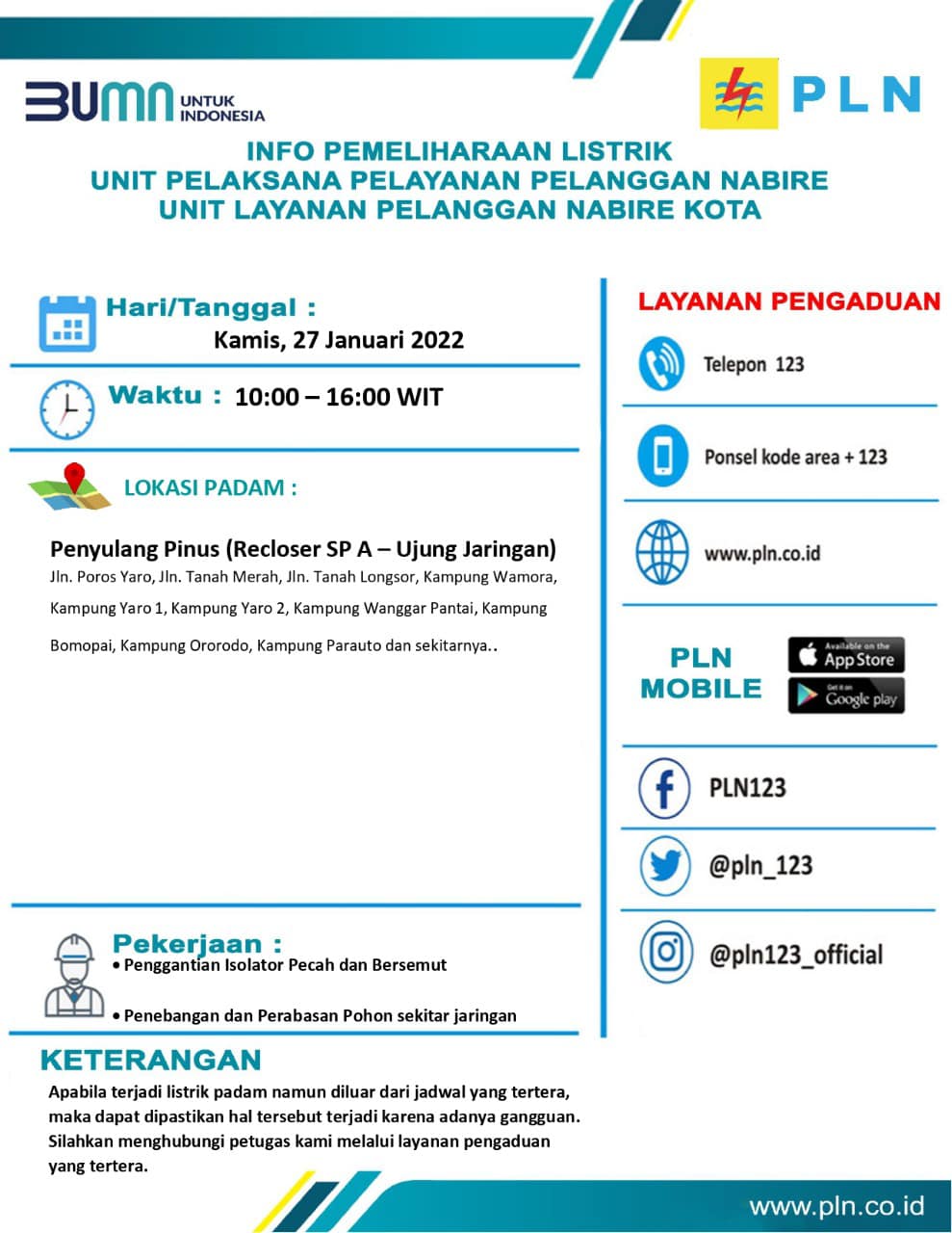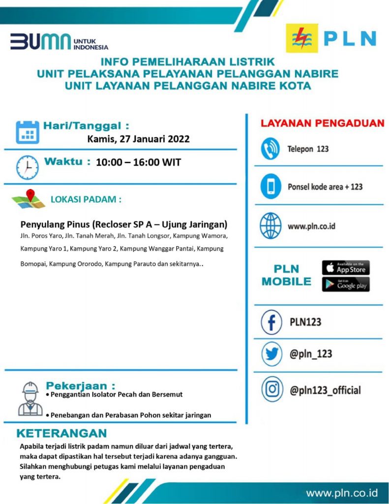 Nabire – Guna kehandalan jaringan Distribusi dan Pembangkit, maka PT. PLN Unit Induk Wilayah Papua & Papua Barat Unit Pelaksana Pelayanan Pelanggan Nabire akan melakukan pemadaman listrik.