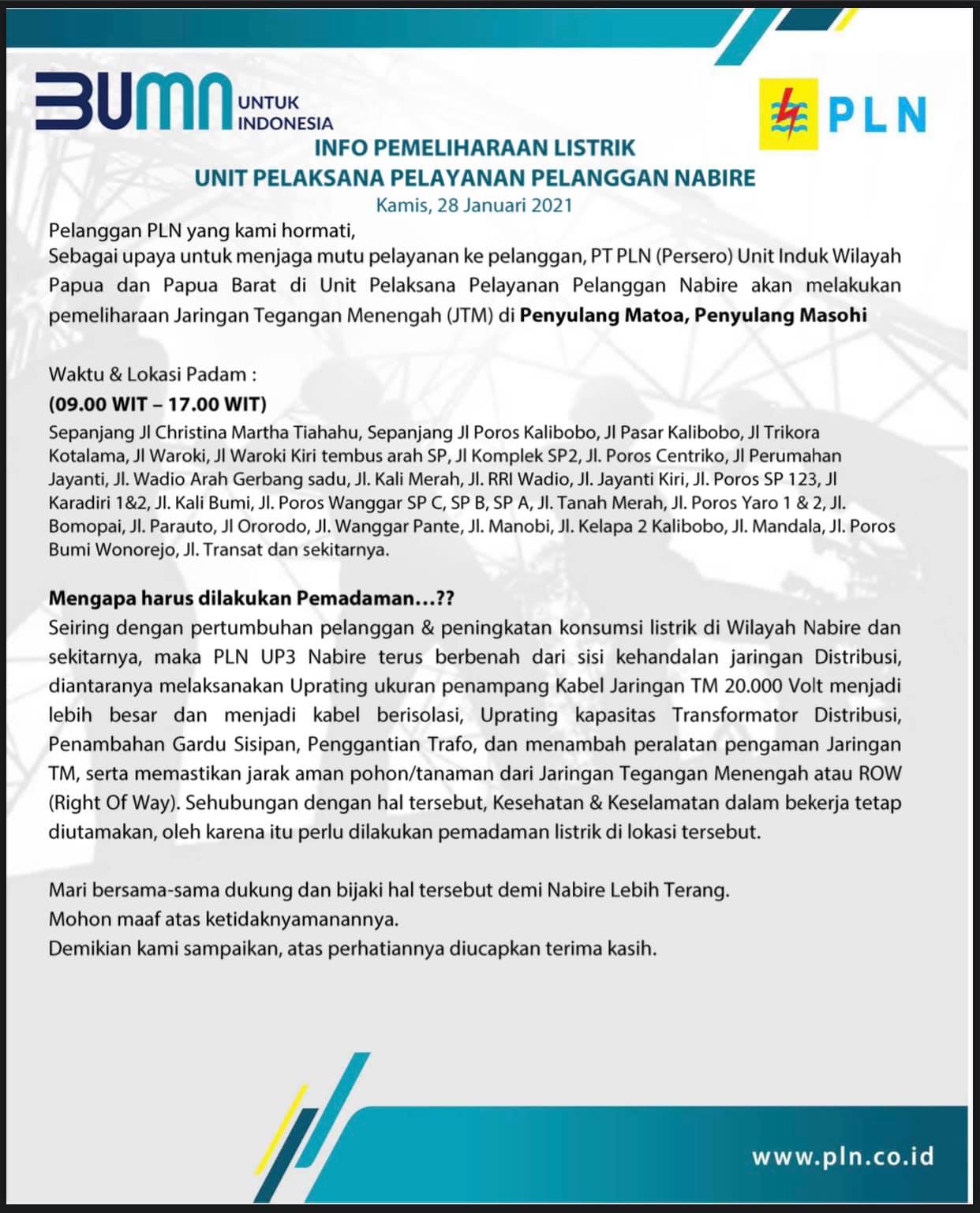 Atas ketidaknyamannya, PT. PLN Rayon Nabire memohon maaf kepada pelanggan PLN di Nabire.
