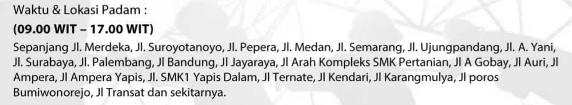 Apabila terjadi pemadaman diluar jadwal yang tertera maka dapat dipastikan hal tersebut karena adanya gangguan. Jika mengalami hal tersebut dapat langsung menghubungi contact center PLN di nomor 0984123.