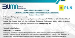 Nabire – Guna kehandalan jaringan Distribusi dan Pembangkit, maka PT. PLN Unit Induk Wilayah Papua & Papua Barat Unit Pelaksana Pelayanan Pelanggan Nabire akan melakukan pemadaman listrik.