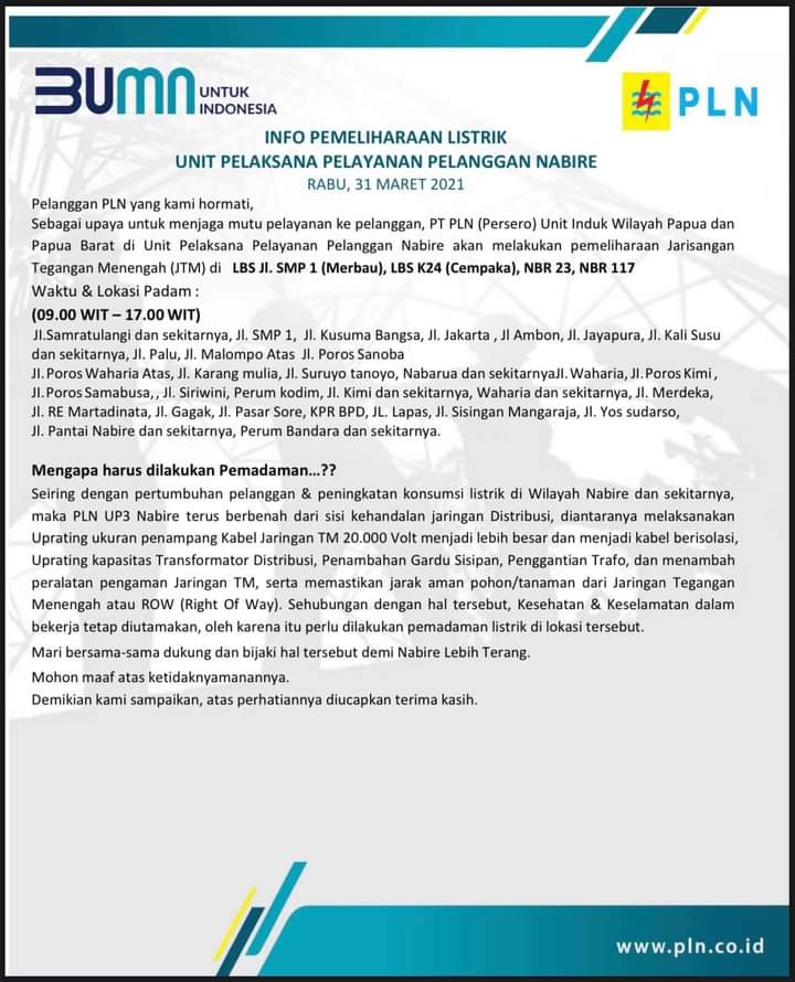 Nabire – Guna kehandalan jaringan Distribusi dan Pembangkit, maka PT. PLN Unit Induk Wilayah Papua & Papua Barat Unit Pelaksana Pelayanan Pelanggan Nabire akan melakukan pemadaman listrik.