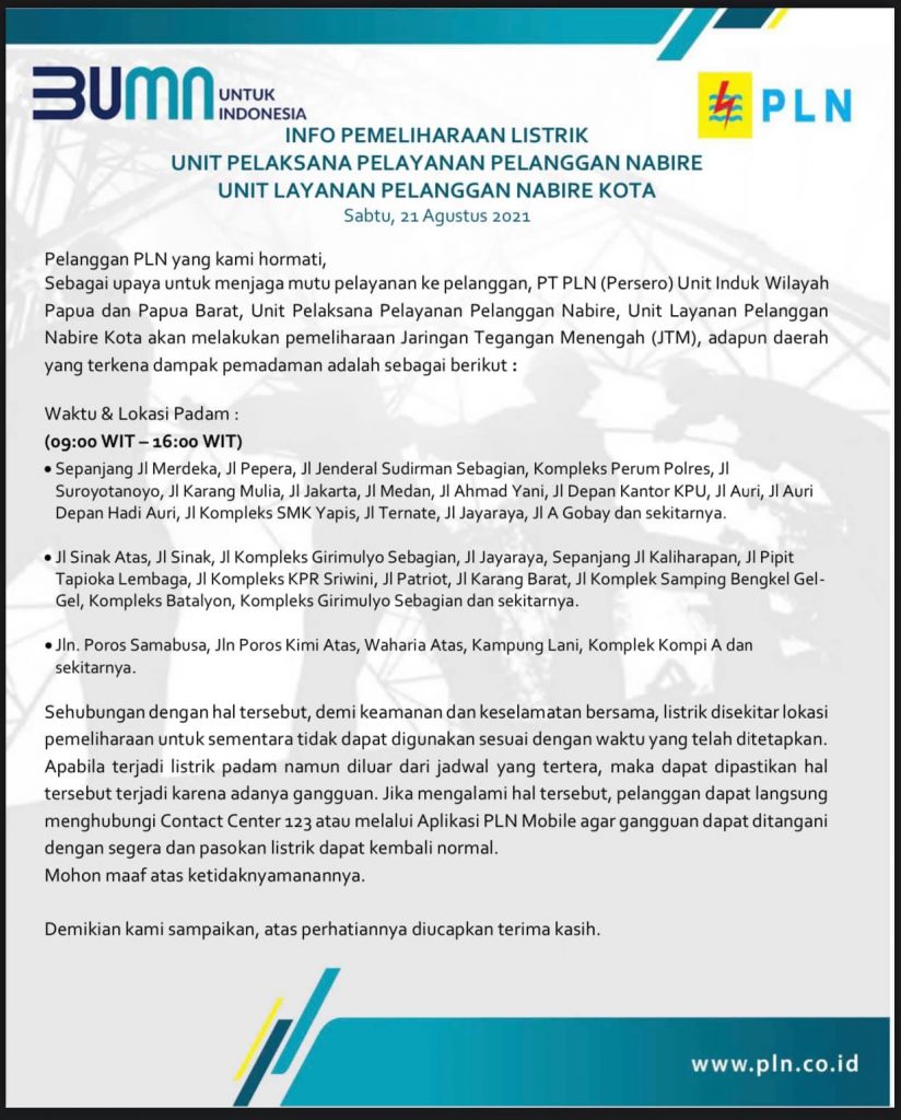 Atas ketidaknyamannya, PT. PLN Rayon Nabire memohon maaf kepada pelanggan PLN di Nabire.