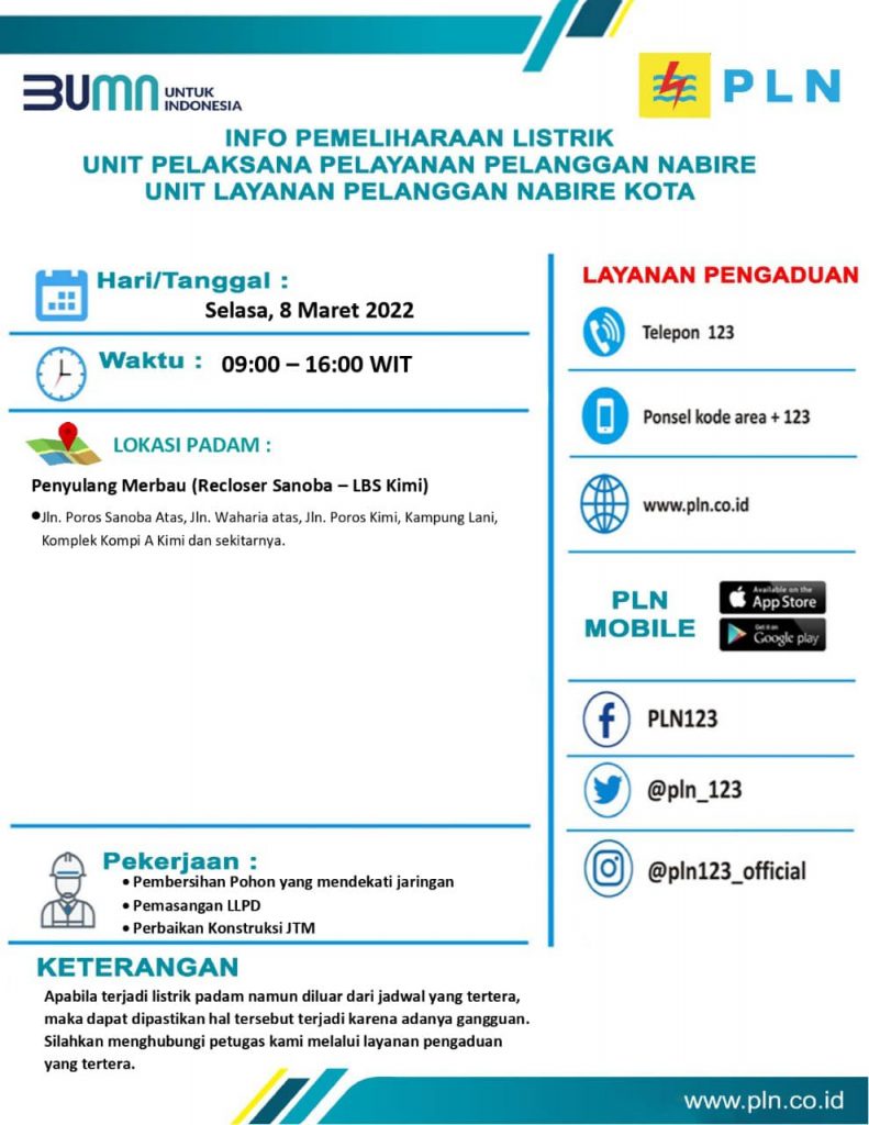 Pemadaman listrik tersebut akan dilaksanakan pada hari Jadwal Pemadaman Listrik Nabire, Jadwal Pemadaman Listrik Nabire, Selasa, 8 Maret 2022, mulai pukul 09.00 s/d 16.00 WIT.