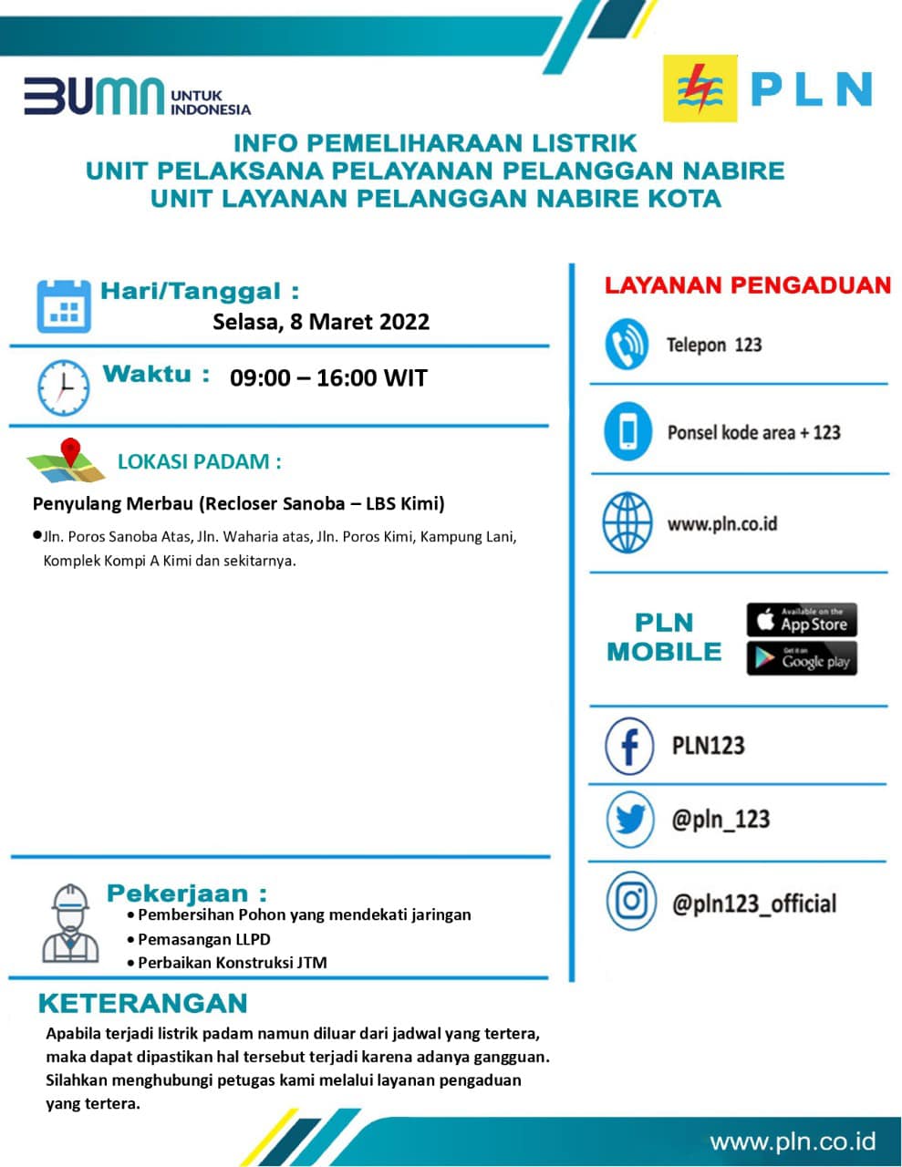 Nabire, Guna kehandalan jaringan Distribusi dan Pembangkit, maka PT. PLN Unit Induk Wilayah Papua & Papua Barat Unit Pelaksana Pelayanan Pelanggan Nabire akan melakukan pemadaman listrik.