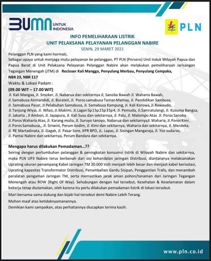 Nabire – Guna kehandalan jaringan Distribusi dan Pembangkit, maka PT. PLN Unit Induk Wilayah Papua & Papua Barat Unit Pelaksana Pelayanan Pelanggan Nabire akan melakukan pemadaman listrik.