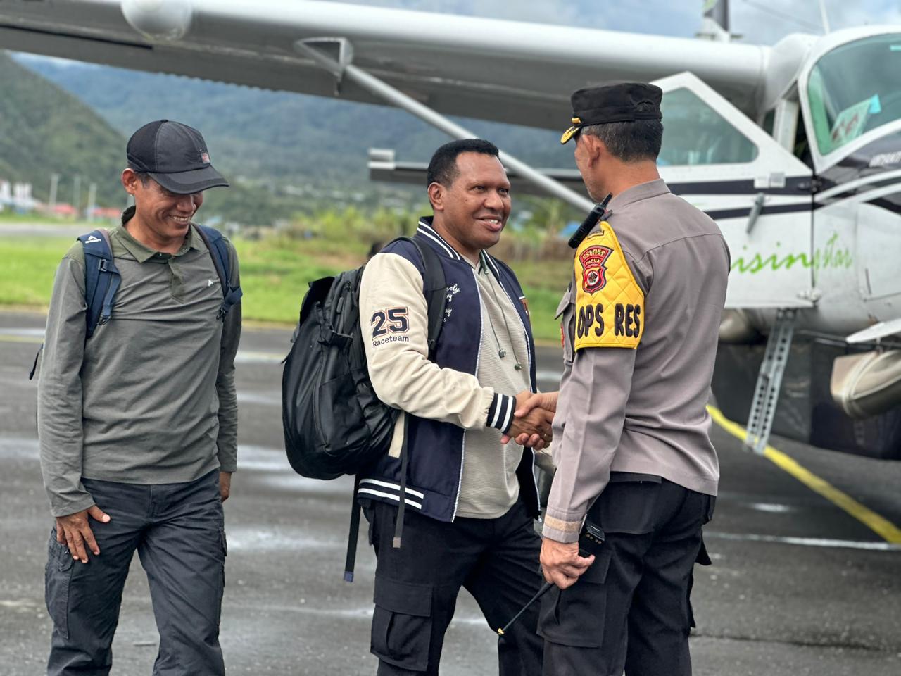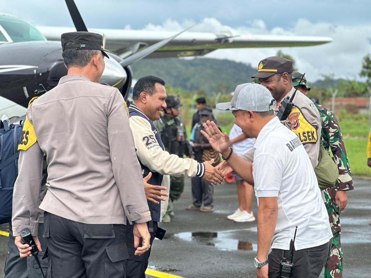 “Kedatangan Pamatwil Kabupaten Dogiyai disambut oleh Kapolres Dogiyai Kompol Sarraju, S.H., bersama Kasat Reskrim Polres Dogiyai, Iptu Syafri Jido, S.Hi dan Kapolsek Kamuu, Ipda Hans N. Raubaba, S.E., di Bandara Moanemani. Rombongan datang menggunakan pesawat Smart Aviation PK-SNV dari Kabupaten Nabire.