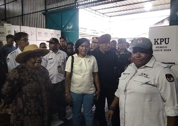 Nabire, Penjabat Gubernur Provinsi Papua Tengah, Dr. Ribka Haluk, S.Sos., MM melakukan inspeksi ke gudang-gudang logistik Pemilu di Kabupaten Nabire. Inspeksi yang dilakukan bersama Forkopimda itu dilakukan guna mengecek kesiapan KPUD dalam melaksanakan Pemilihan Umum (Pemilu) tanggal 14 Februari 2024 mendatang.