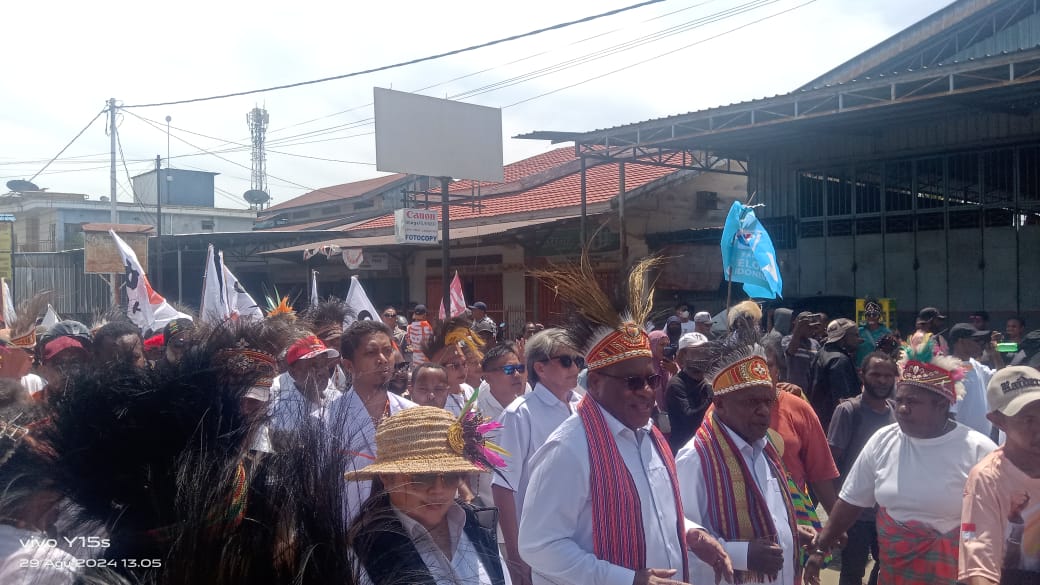 Nabire, 29 Agustus 2024 – Paslon John Wempi Wetipo dan Ausilius You, mendaftar Pilgub ke Komisi Pemilihan Umum (KPU) Provinsi Papua Tengah pada Kamis (29/08) pukul 13.15 WIT. Mengenakan kemeja putih, pasangan ini tiba di kantor KPU dengan diiringi tarian adat yang memeriahkan suasana.
