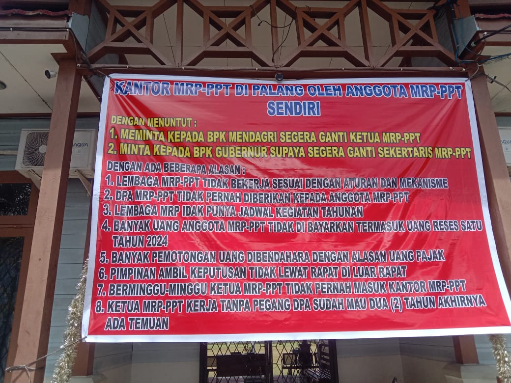 Nabire, 25 Juni 2025 – Kantor Majelis Rakyat Papua – Provinsi Papua Tengah (MRP-PPT) di Kalibobo Nabire dipalang oleh para anggotanya sendiri sebagai bentuk protes terhadap kepemimpinan internal lembaga tersebut. Aksi pemalangan ini dilakukan sebagai respons atas sejumlah persoalan serius yang dinilai menghambat kinerja MRP-PPT.