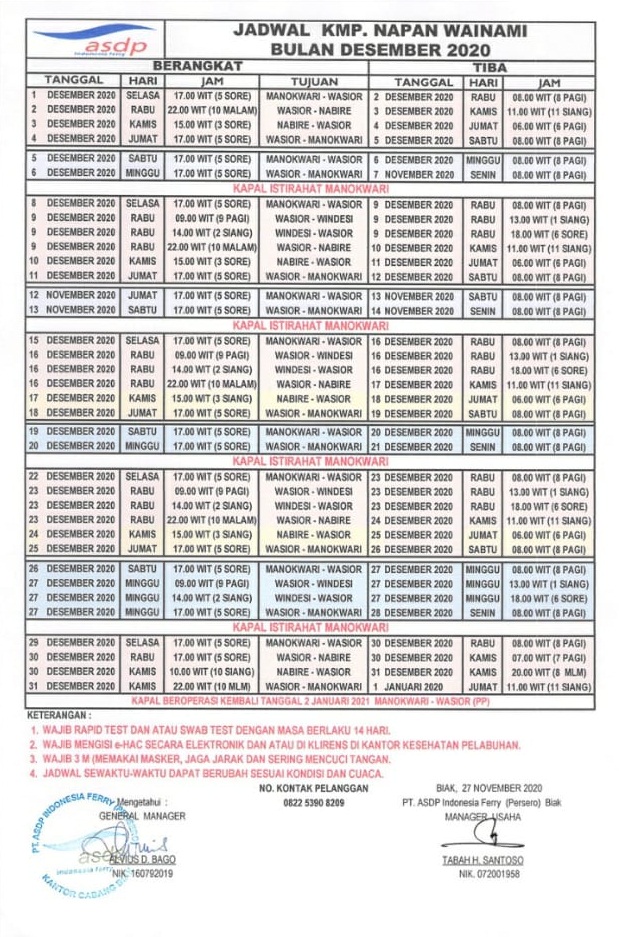 Berikut ini jadwal pelayaran kapal KMP Napan Weinami selama bulan Desember 2020 :