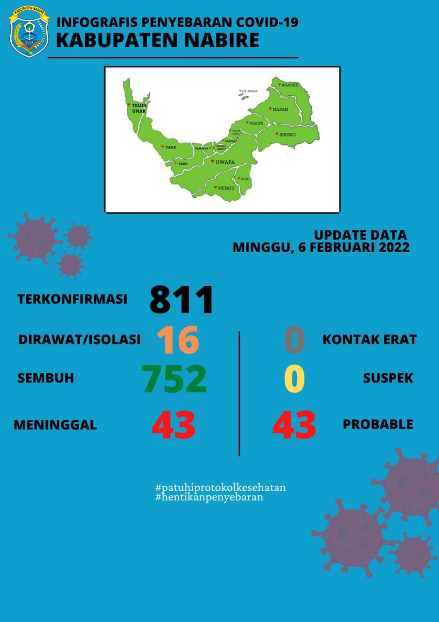 Nabire, Kasus Covid-19 di kabupaten Nabire kembali bertambah. Tercatat ada 16 kasus baru terkonfirmasi hingga Minggu (06/02), dari total 811 kasus.