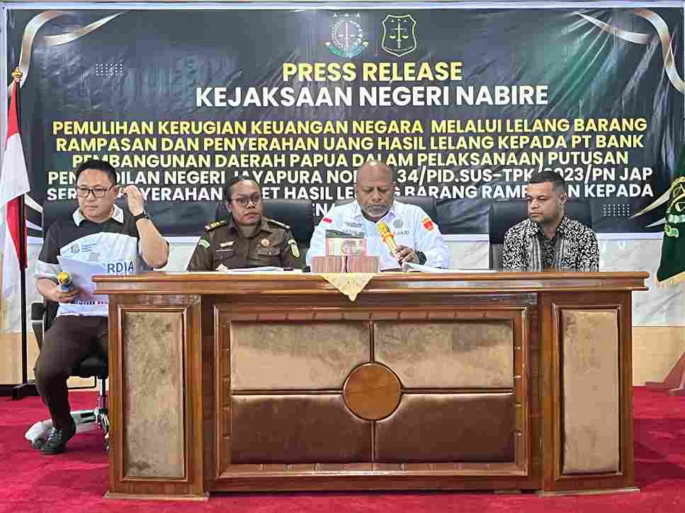 Nabire, 9 Desember – Kejaksaan Negeri (Kejari) Nabire kembali menunjukkan komitmen kuat dalam pemberantasan korupsi melalui pemulihan kerugian keuangan negara. Bertempat di aula Kejaksaan Negeri Nabire, Senin (9/12), Kejari Nabire menggelar konferensi pers sekaligus menyerahkan hasil lelang barang rampasan kepada para pemenang lelang dan PT Bank Pembangunan Daerah Papua sebagai penerima Penerimaan Negara Bukan Pajak (PNBP).
