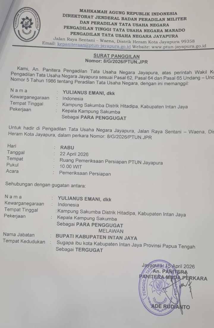 Intan Jaya, 18 April 2026 – Ketua BPD KAPP Kabupaten Intan Jaya, Yance Emani, menegaskan bahwa pelantikan Kepala Kampung Sakumba, Distrik Hitadipa, atas nama Sepanus Emani, sah secara administratif dan memiliki kekuatan hukum. Pernyataan ini disampaikan menyusul polemik gugatan di Pengadilan Tata Usaha Negara (PTUN) Jayapura dengan nomor perkara 8/G/2026/PTUN-JPR.