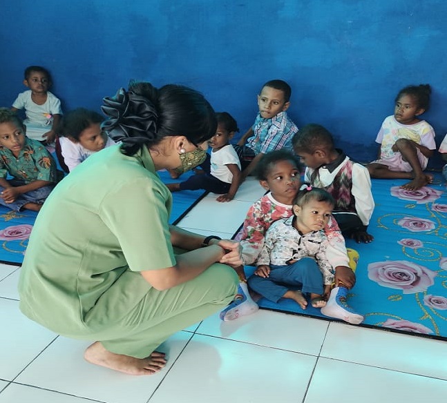 Rombongan Ibu-Ibu Persit KCK diterima oleh Ibu Deby Wayoi mewakili Ketua Yayasan Difabel Nabire, Ibu Maria Yeti Asri, S.Sos. Hadir juga guru-guru Yayasan Difabel Nabire.