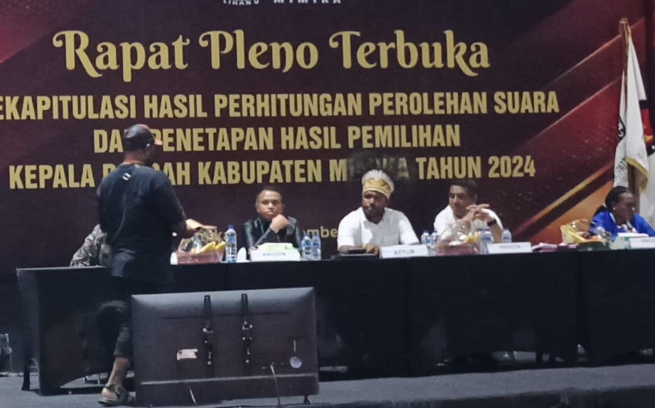 Mimika, 10 Desember 2024 – Komisi Pemilihan Umum (KPU) Kabupaten Mimika resmi menetapkan hasil perolehan suara tiga pasangan calon (Paslon) bupati dan wakil bupati Mimika dalam Pilkada 2024. Penetapan dilakukan pada Senin (9/12/2024) malam di GOR Futsal Timika, sekitar pukul 23:30 WIT.