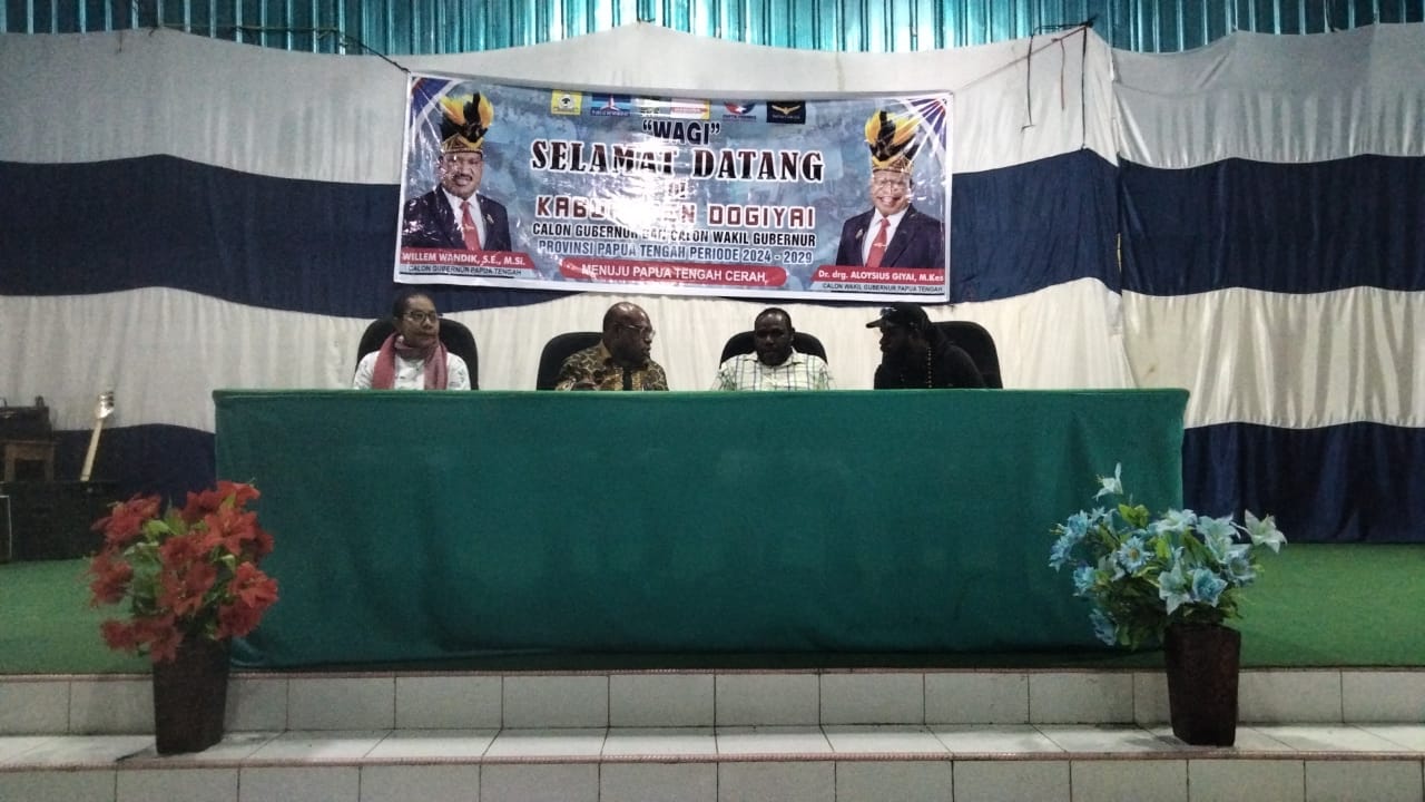 Dogiyai, 28 September 2024 – Calon Wakil Gubernur Papua Tengah nomor urut 4, Dr. drg. Aloysius Giyai, M.Kes, melakukan kunjungan ke kabupaten Dogiyai, Jumat (27/09/2024.