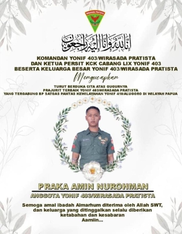 Jenazah Praka Amin Nurohman telah dievakuasi ke kampung halamannya di Jawa Tengah untuk dimakamkan secara militer sebagai bentuk penghormatan atas jasa dan pengorbanannya dalam menjaga kedaulatan negara di wilayah Papua Barat.