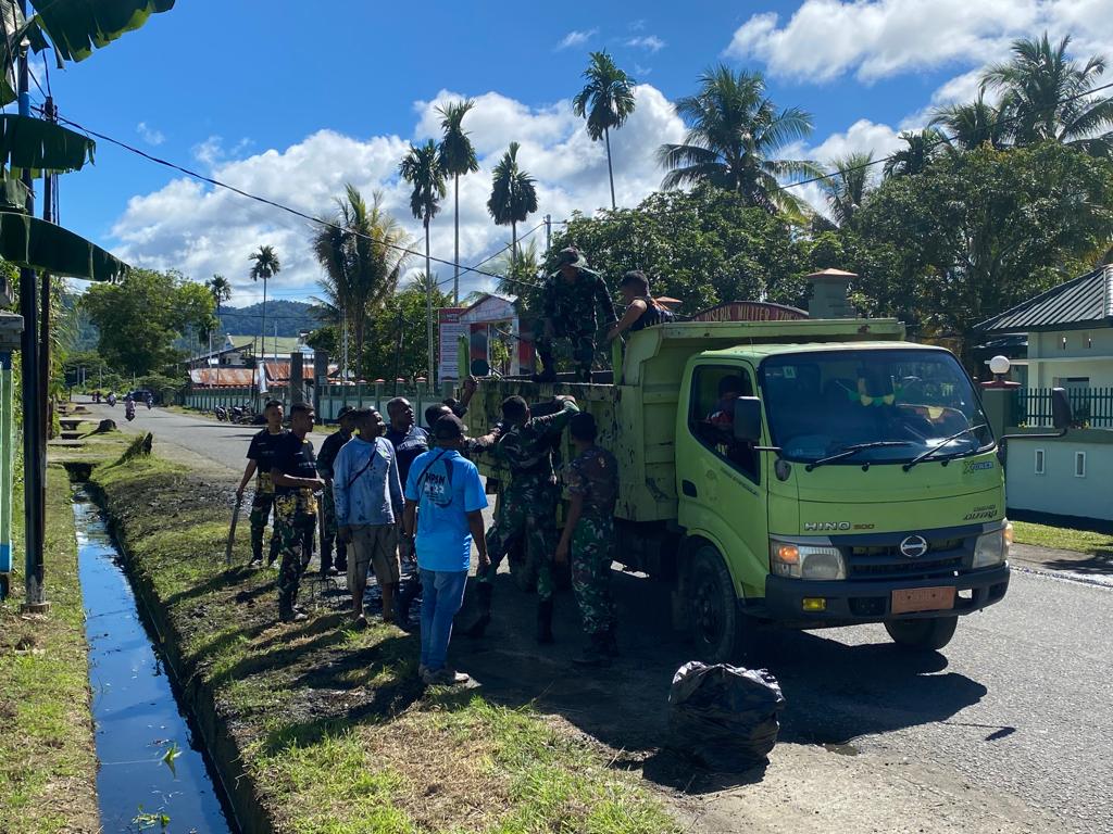 Kegiatan ini melibatkan aparat dari Yonif 753/AVT dan Denzipur 12 OHH dengan sasaran Jumat Bersih kali ini yaitu membersihkan parit.