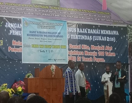 Nabire, Koordinator Pemuda GKIP wilayah Meepago melantik Koordinator Pemuda GKIP Wilayah Deiyai, Dogiyai, dan Teluk cenderawasih, Minggu (16/01), bertempat di gedung gereja GKIP Jemaat Kasih, Kampung Kali Harapan, Jl. Yapis, Karang Mulia, Nabire, Papua.