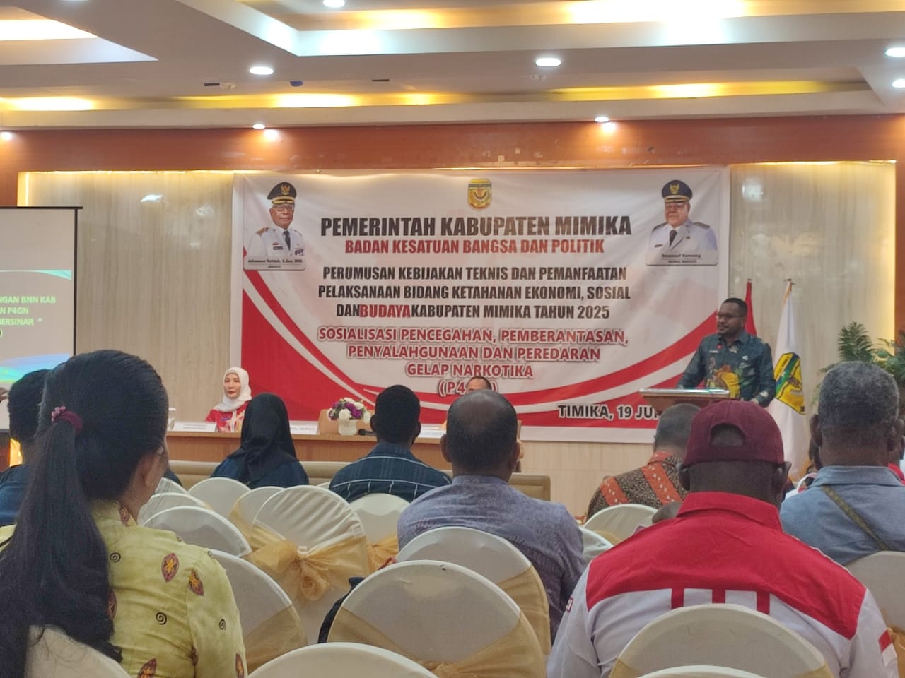 Timika, 19 Juni 2025 – Pemerintah Kabupaten (Pemkab) Mimika menunjukkan komitmen serius dalam mendukung pemberantasan penyalahgunaan dan peredaran narkotika dan obat-obatan terlarang (narkoba) di wilayahnya. Melalui Badan Kesatuan Bangsa dan Politik (Kesbangpol), Pemkab Mimika menggelar sosialisasi Pencegahan, Pemberantasan, Penyalahgunaan, dan Peredaran Gelap Narkotika (P4GN) yang berlangsung di Grand Tembagapura Hotel, Kamis (19/6/2025).