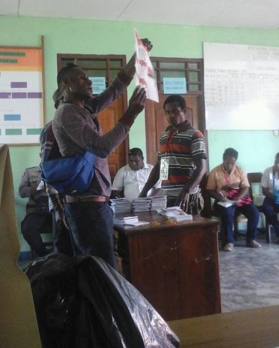 Hingga malam ini, perhitungan suara sementara dipimpin oleh pasanga Mathius Awoitauw dan Giri Wijayantoro yang menggungguli pasangan nomor urut 5 Jansen Monim dan Abdul Rahman Sulaiman.