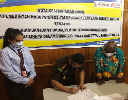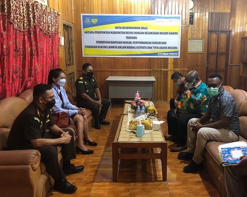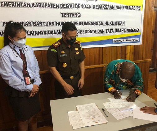 Nabire, Bertempat di ruang rapat Kejaksaan Negeri Nabire, telah dilaksanakan kegiatan penandatanganan nota kesepahaman (MoU) antara Pemkab Deiyai dengan Kejaksaan Negeri Nabire tentang pemberian bantuan hukum, pertimbangan hukum dan tindakan hukum lainnya dalam bidang perdata dan tata usaha negara.