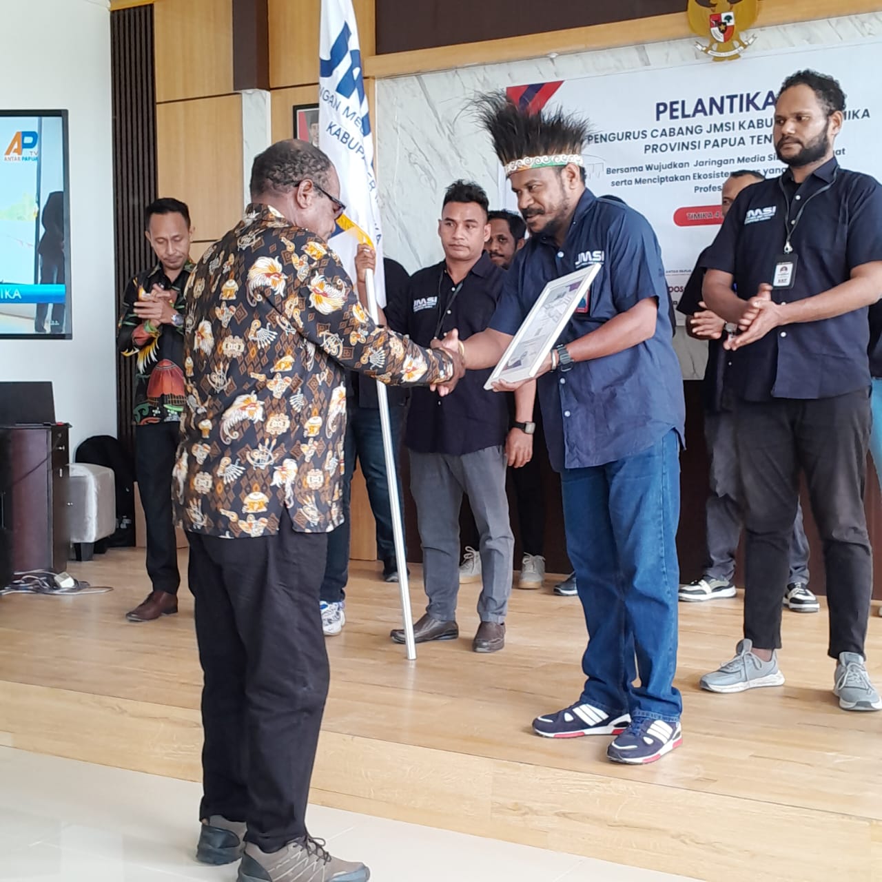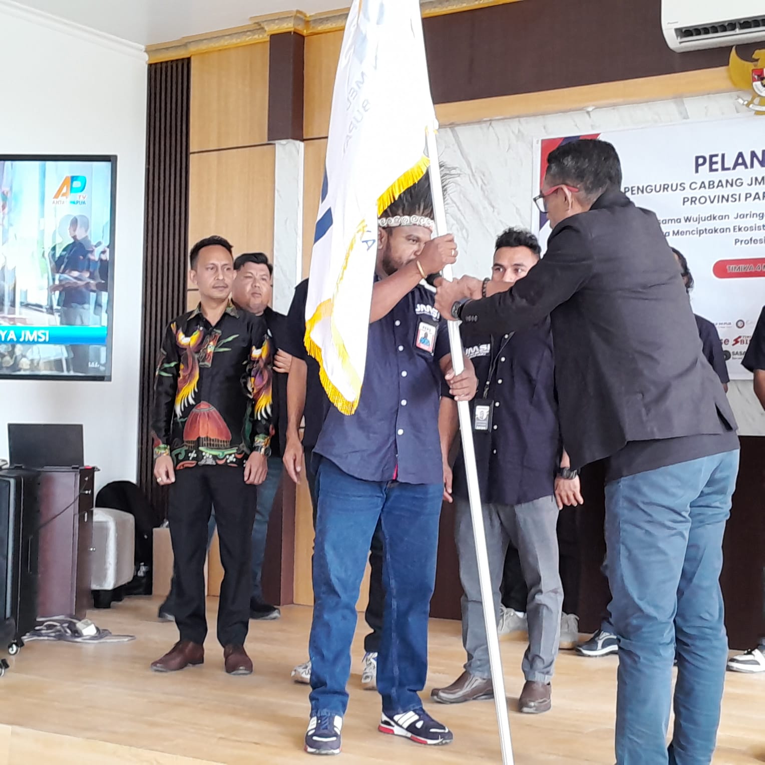 Pelantikan Pengcab JMSI Mimika ditandi juga dengan penyerahan Pataka JMSI oleh Ketua JMSI Provinsi Papua Tengah, Iwan S Makatita kepada Ketua JMSI Kabupaten Mimika, Zadrak Rayar.