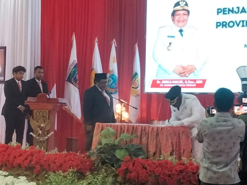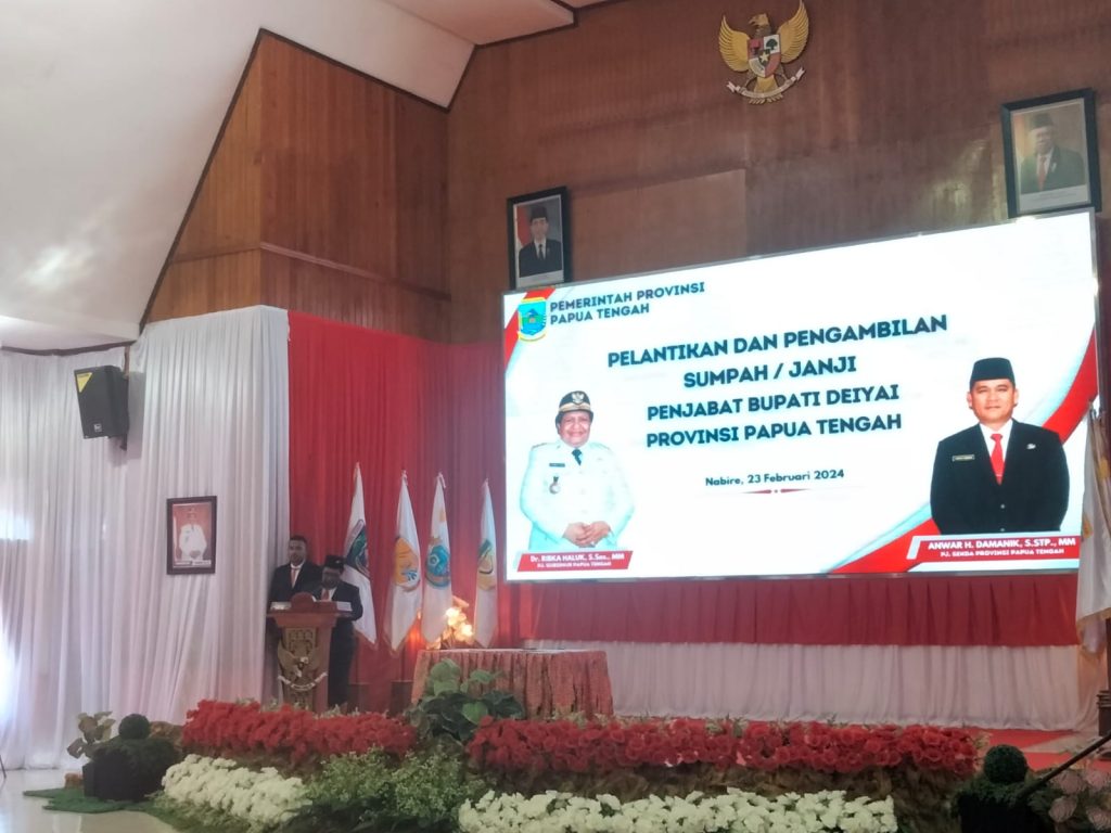 Nabire, Penjabat Gubernur Papua Tengah, Dr. Ribka Haluk, S.Sos., MM melantik Elimelek Edowai sebagai Penjabat (Pj) Bupati Deiyai. Pelantikan ini merupakan bagian dari aktivitas penyelesaian pemerintahan yang rutin dilakukan, Nabire, Jumat (23/02/2024).
