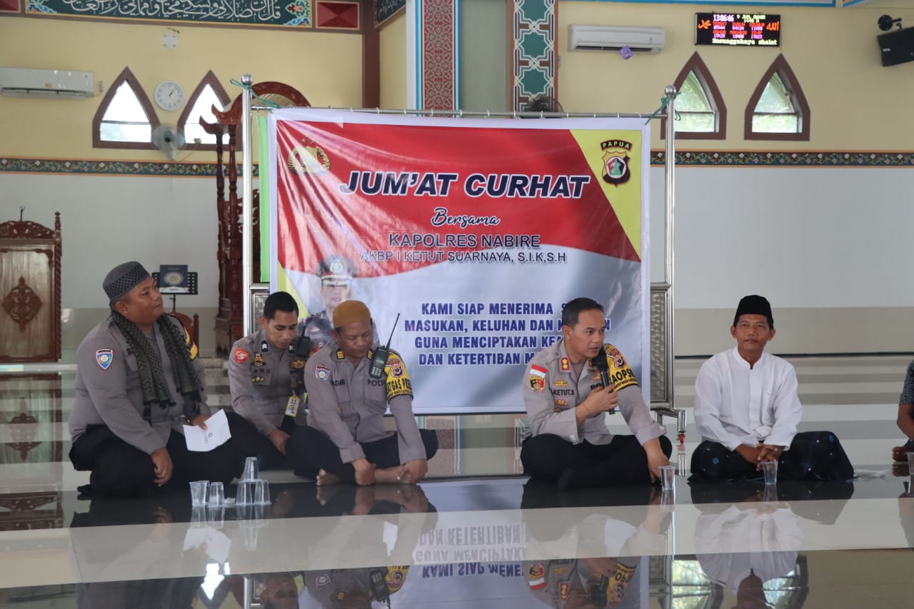 Nabire, Dalam rangka mempererkuat situasi kamtibmas di kabupaten Nabire, Kapolres Nabire, AKBP I Ketut Suarnaya, S.I.K., S.H, memimpin kegiatan Jumat Curhat di Mesjid Nurul Huda Bumi Wonorejo, Nabire, Papua Tengah, Jumat (22/12/2023).