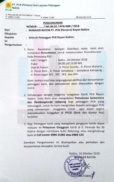PT PLN Rayon Nabire juga menghimbau kepada warga Nabire yang belum melakukan pembayaran listrik untuk segera melunasi tunggakan listriknya, dikarenakan akan dilakukan pemutusan listrik kepada warga yang masih menunggak pembayaran listrik.