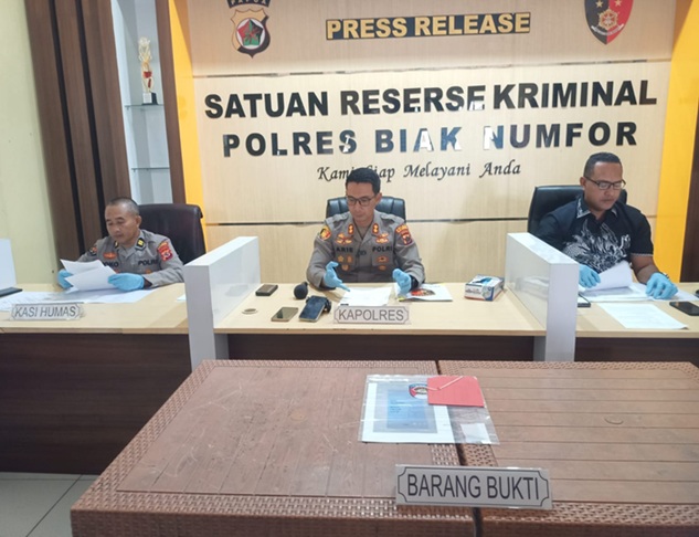Kasus tersebut disampaikan dalam konferensi pers yang digelar di Mapolres Biak Numfor, Selasa (24/2/2026), dipimpin Kapolres Biak Numfor Ari Trestiawan, didampingi Kasat Reskrim Ipda Daniel Z. Rumpaidus serta Kasi Humas Ipda Joko Susilo.