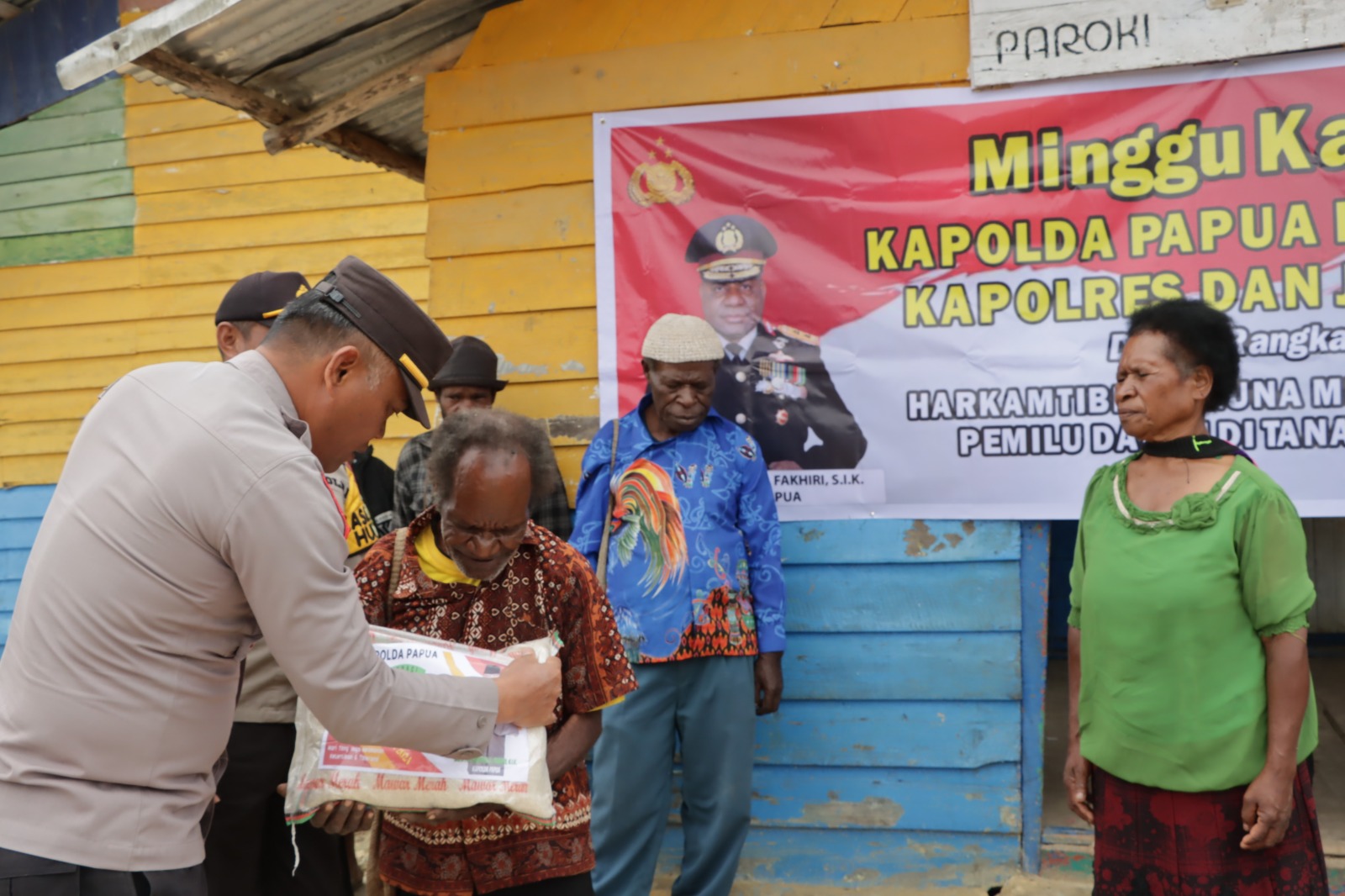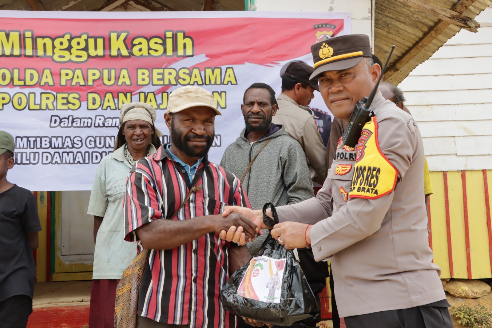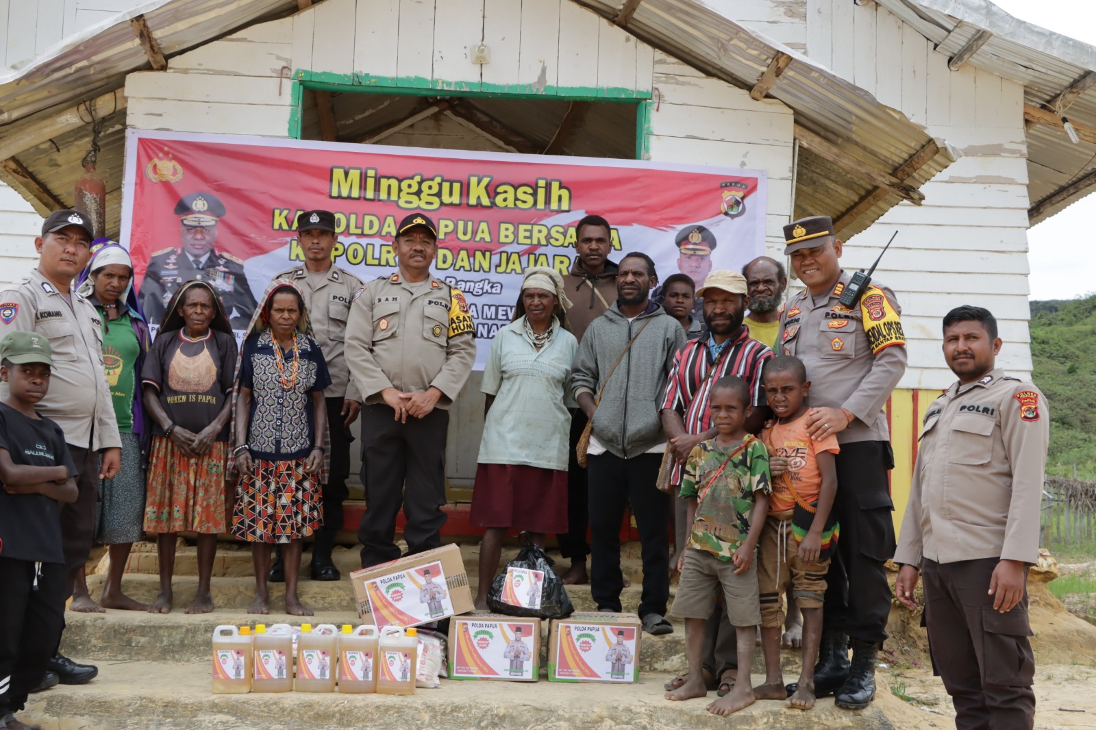Pada kegiatan minggu kasih yang dilaksanakan ini Kabag Ops Polres Paniai bersama dengan Kasat Binmas Polres Paniai dan Anggota Sat Binmas memberikan bantuan sarana kontak berupa beras, super mie dan juga gula kopi serta minyak goreng kepada warga jemaat sebagai bentuk cinta kasih Polri kepada masyarakat.